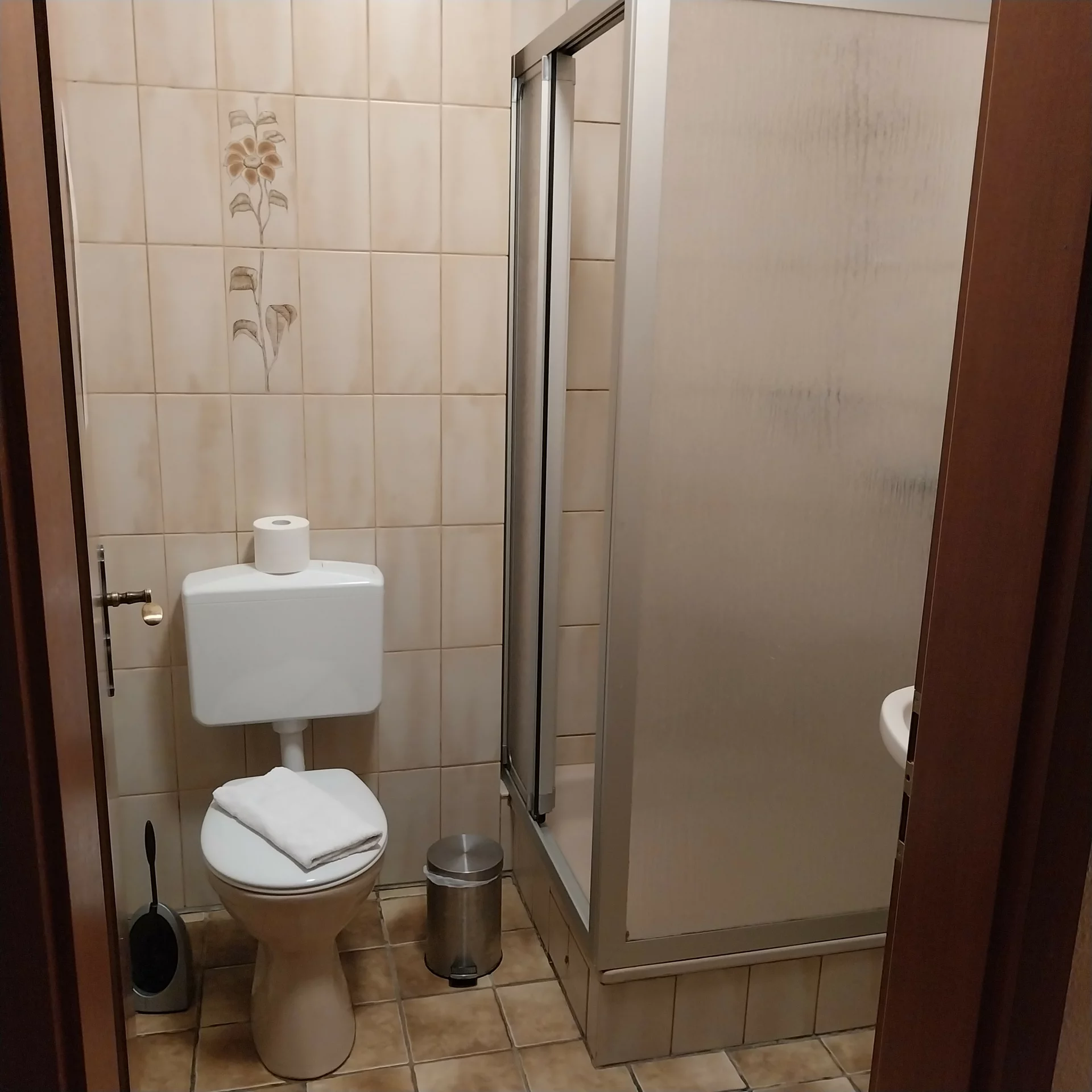 Badezimmer mit Dusche, WC, Waschbecken, Handtücher, Fön, Seife